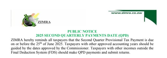 The Zimbabwe Revenue Authority (ZIMRA) issued a public notice on the 2025 Second Quarter Provisional Tax Payment which was due on June 25. ZITAP circulates these public notices for tax-payers to know the ZIMRA requirements.