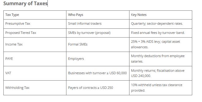 If an SME employs staff, it must register for PAYE within 14 days and withhold tax from employee salaries monthly, based on ZIMRA tax tables.